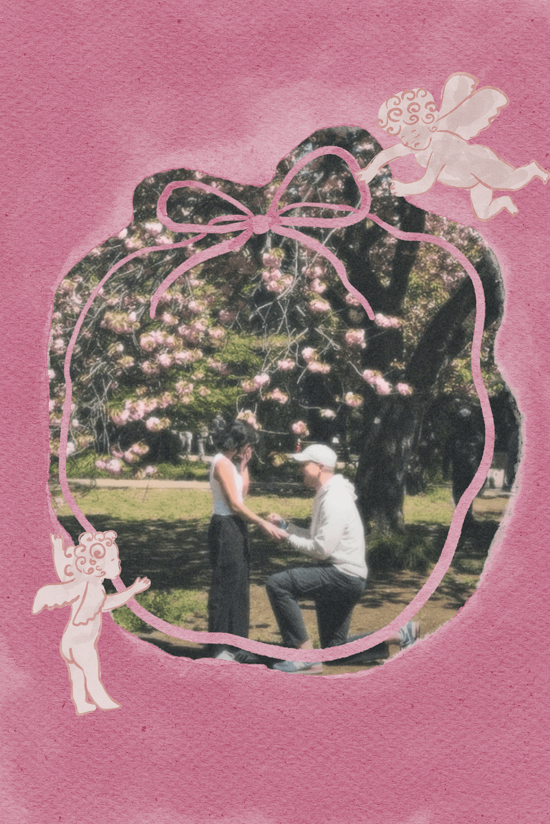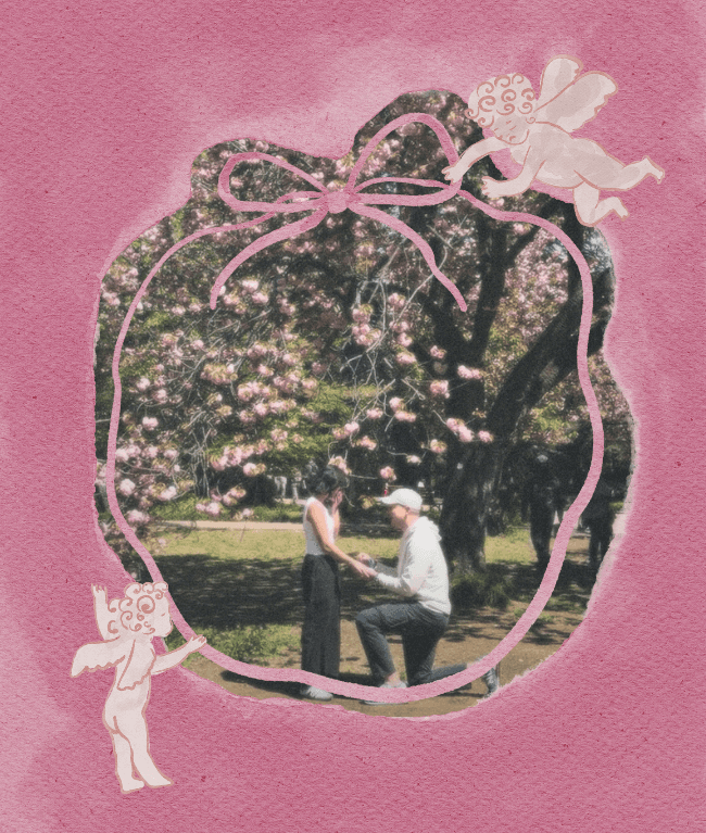 Keegan proposed under a cherry blossom tree in Shinjuku Gyoen National Garden in Tokyo, Japan